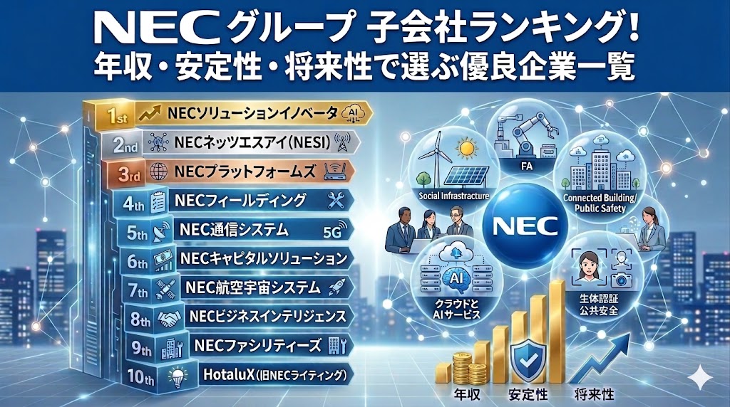 本記事では、NECグループ子会社を、「年収」「安定性(親会社との依存度)」「将来性(成長分野)」という3つの独自の指標でランキング化。あなたにとっての「隠れた優良企業」を見つけるための全知識を本音解説します。